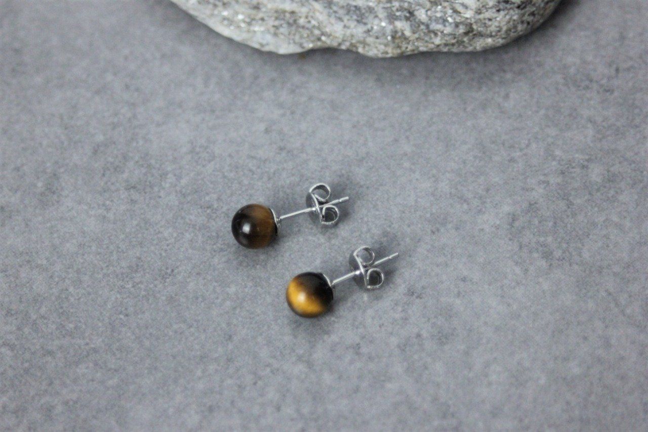 Boucles d'oreilles en oeil de tigre et argent massif Ø6mm - Puces d'oreilles pierres naturelles - Clous d'oreilles pierres gemmes