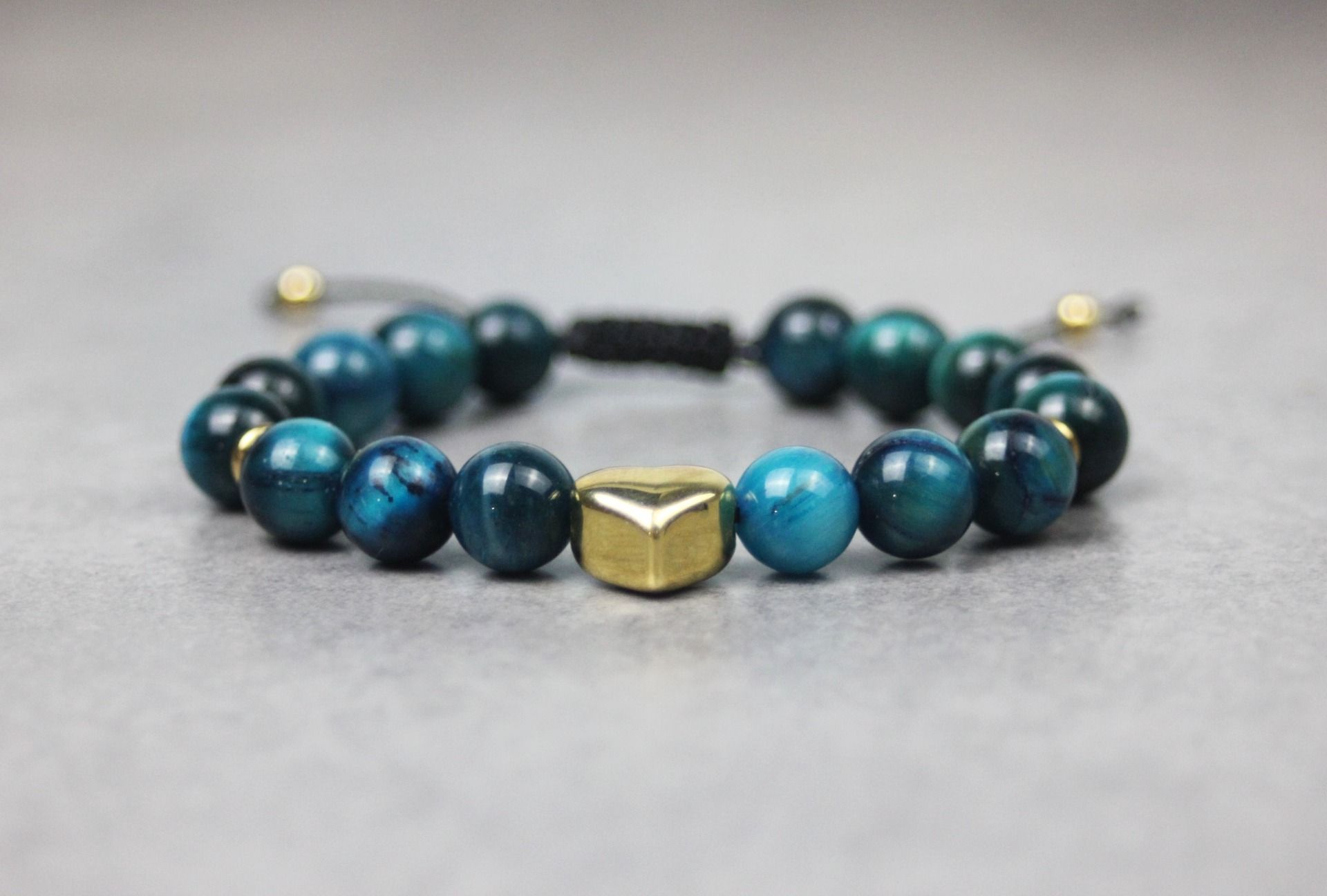 Bracelet en pierres naturelles semi-précieuses. Matériaux utilisés : perles oeil de tigre bleu, coeur et perles en acier inoxydable doré. Fermoir coulissant (convient à tous les poignets)