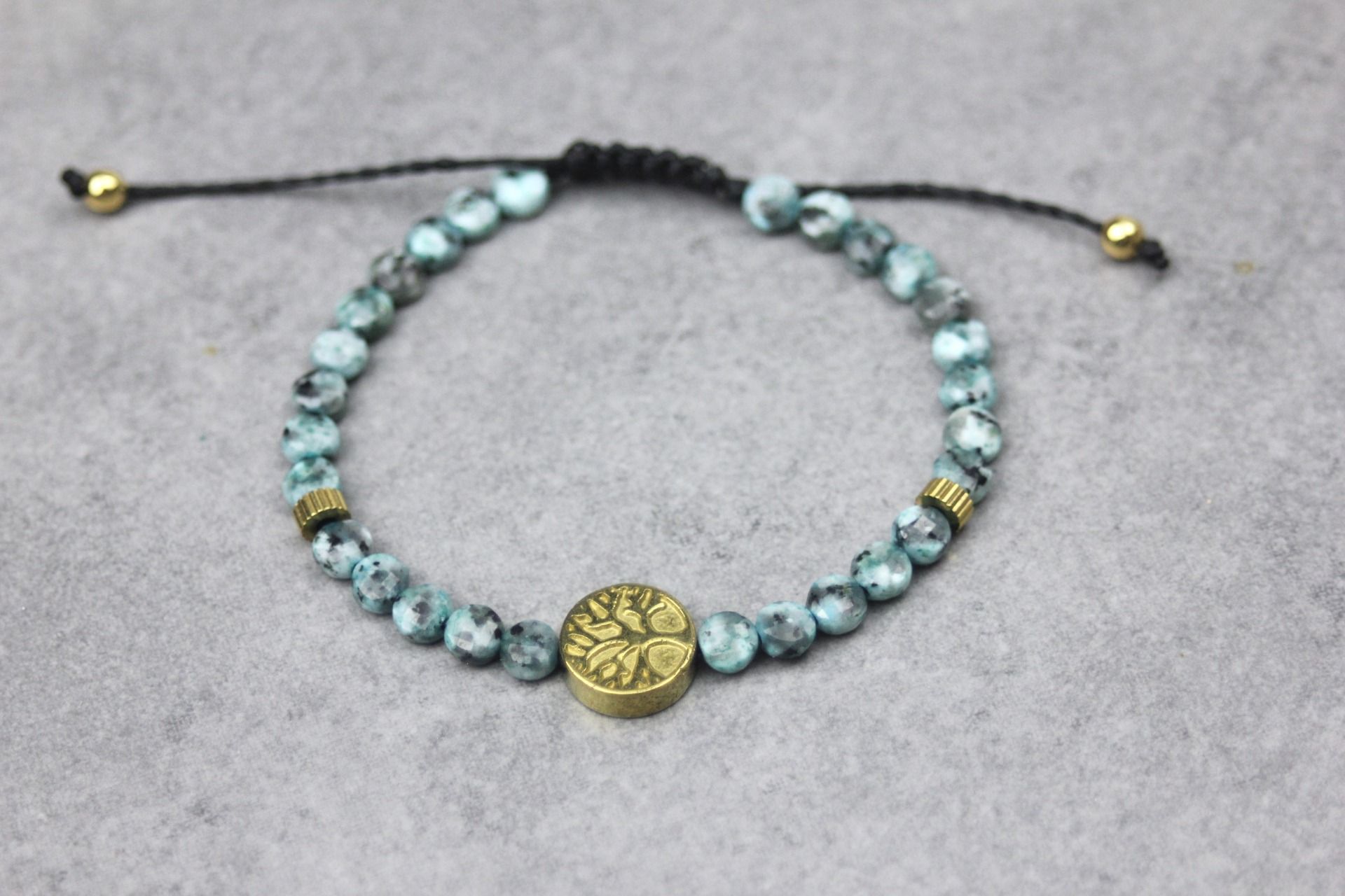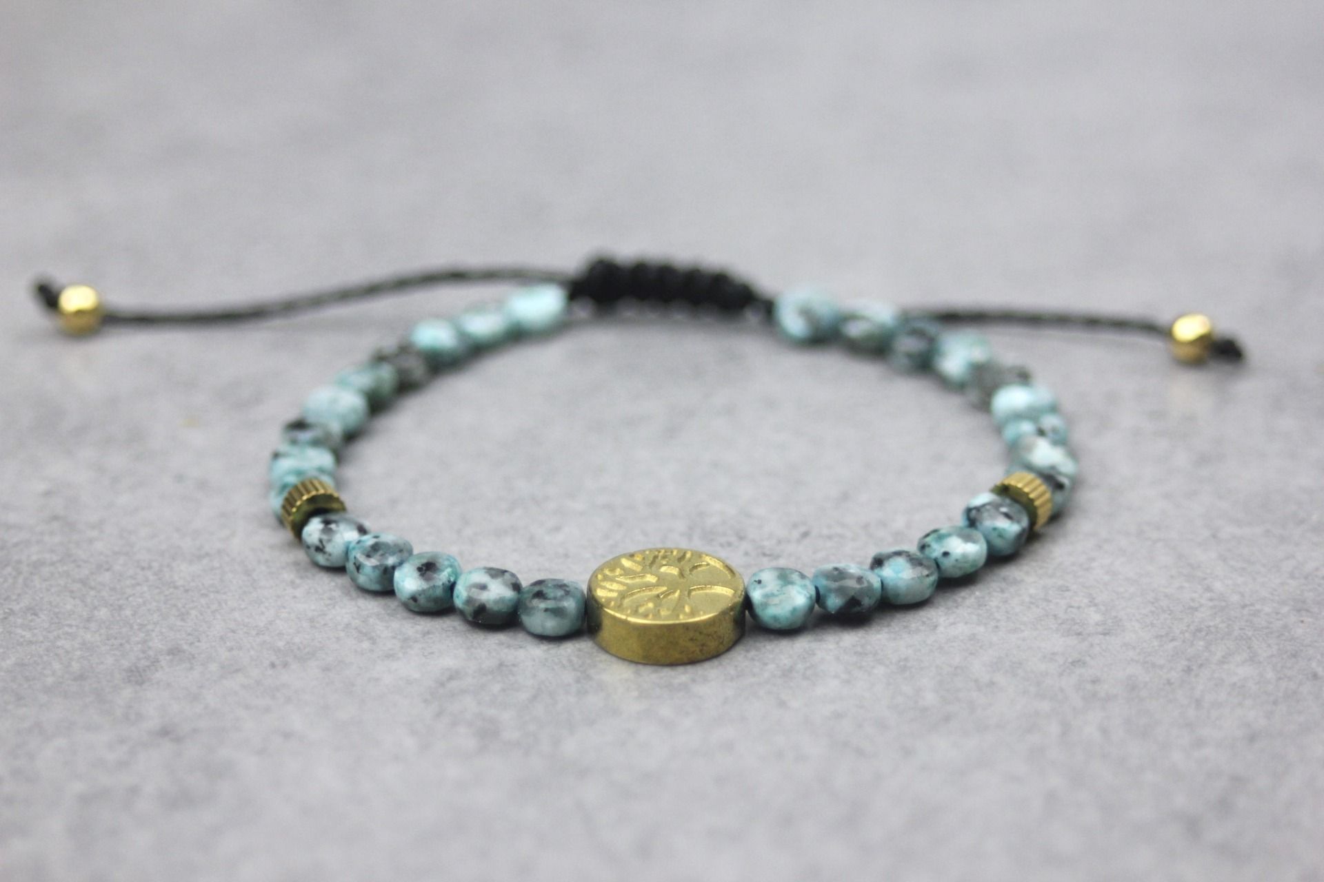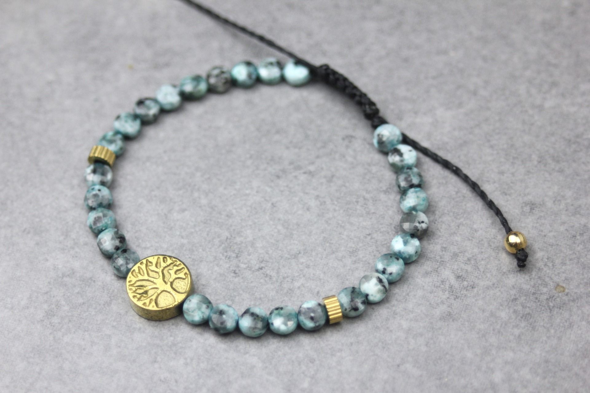 Bracelet en pierres naturelles, jaspe dalmatien turquoise facettées Ø5mm, arbre de vie hématite dorée et acier doré - bracelet femme en pierres naturelles - bracelet cordon