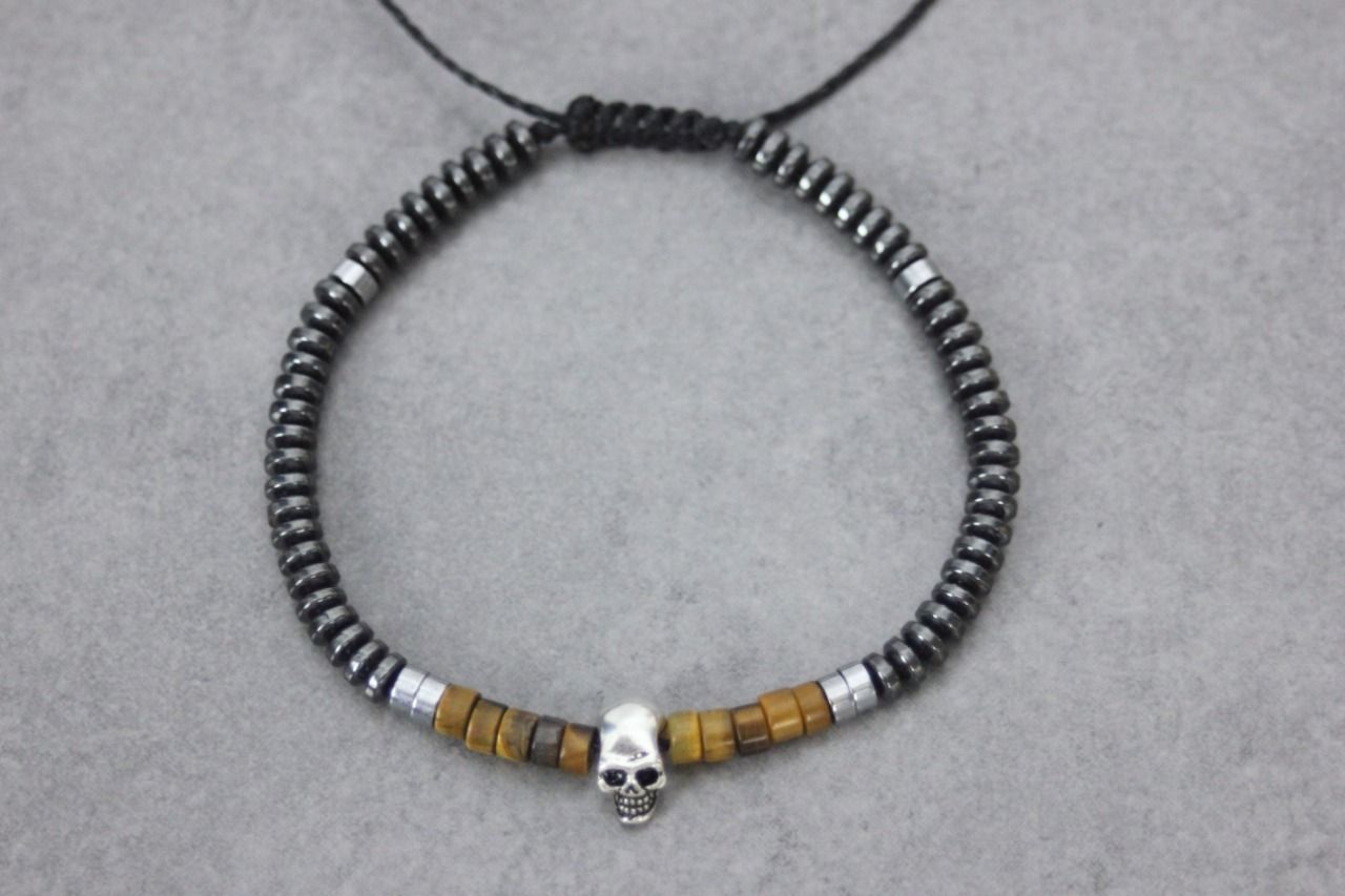 Bracelet en pierres naturelles semi-précieuses. Matériaux utilisés : perles heishi oeil de tigre, hématite, hématite argentée et tête de mort en argent massif. Fermoir coulissant (convient à tous les poignets)