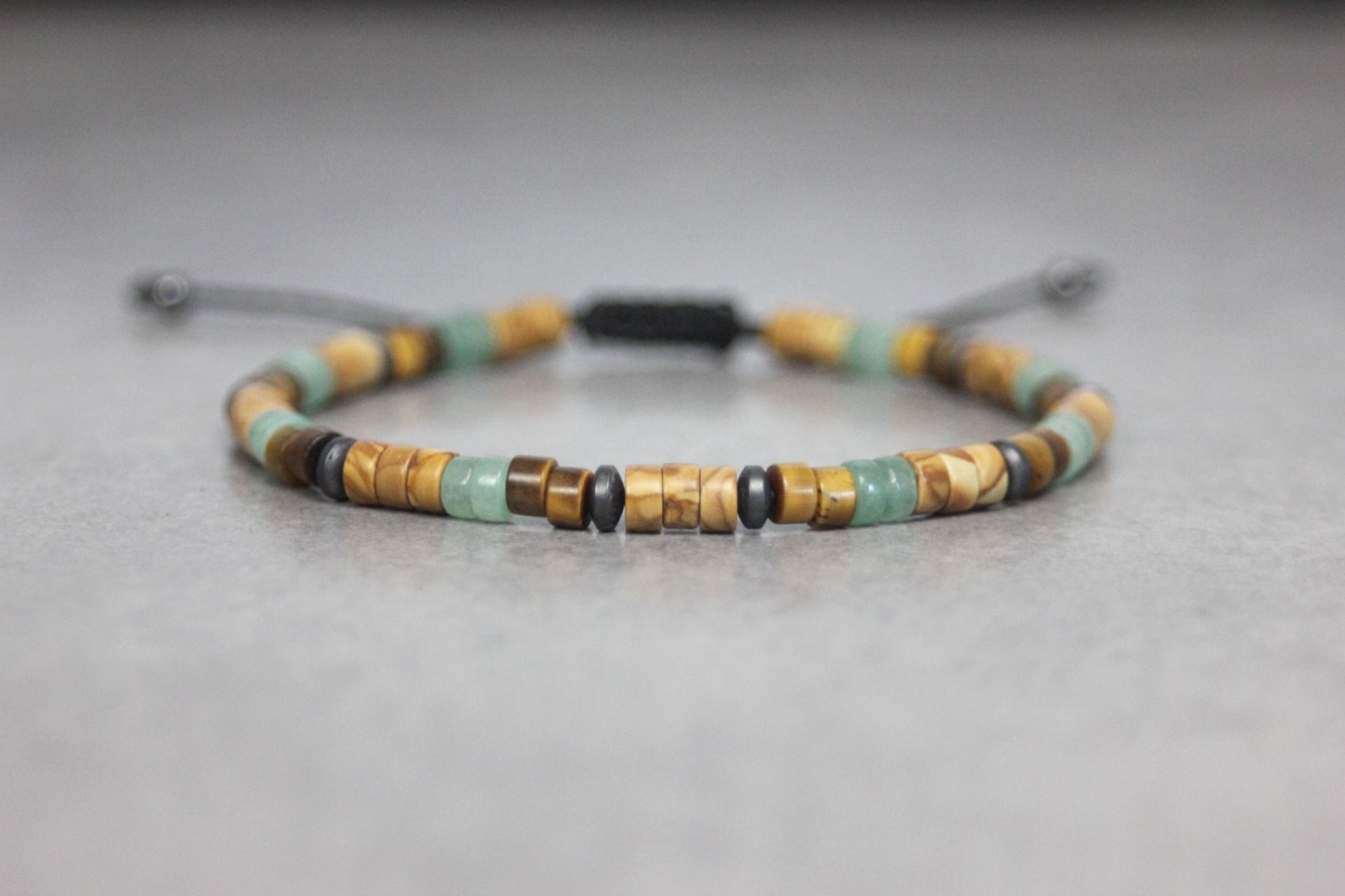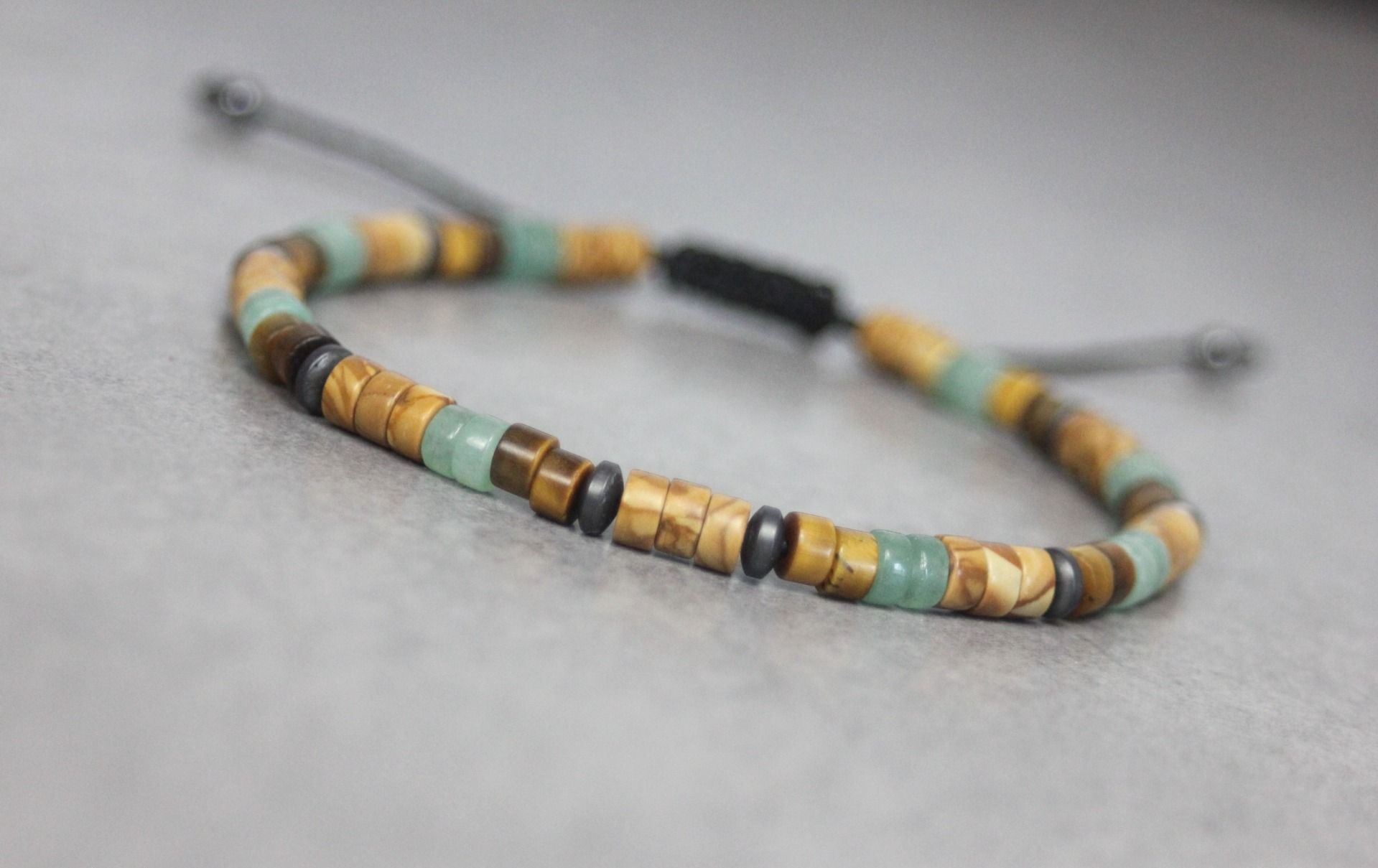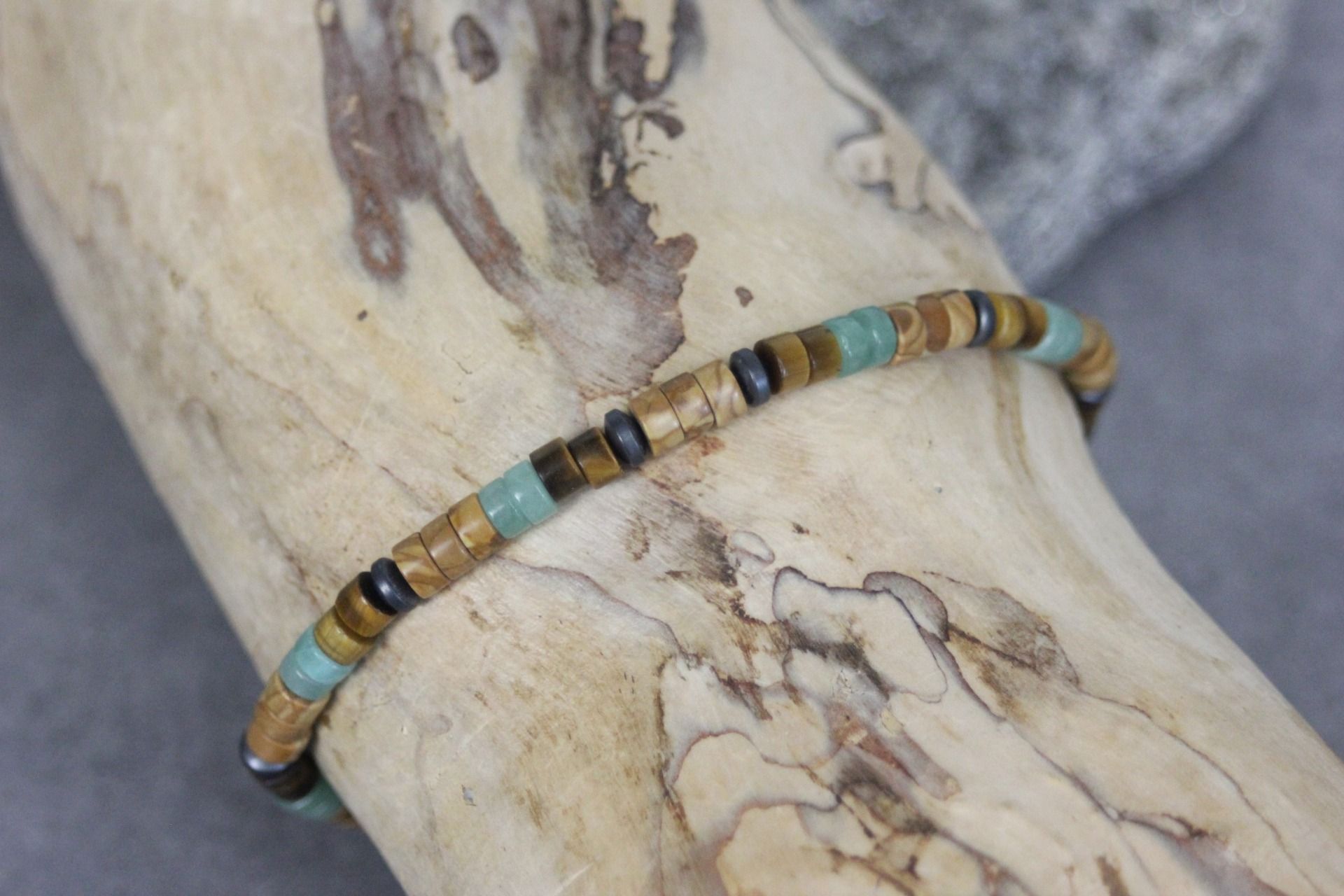 Bracelet homme perles heishi en wood stone, jade verte, œil de tigre et hématite mat Ø4mm - bracelet pierres naturelles - bracelet pierres gemmes - Bracelet surfeur
