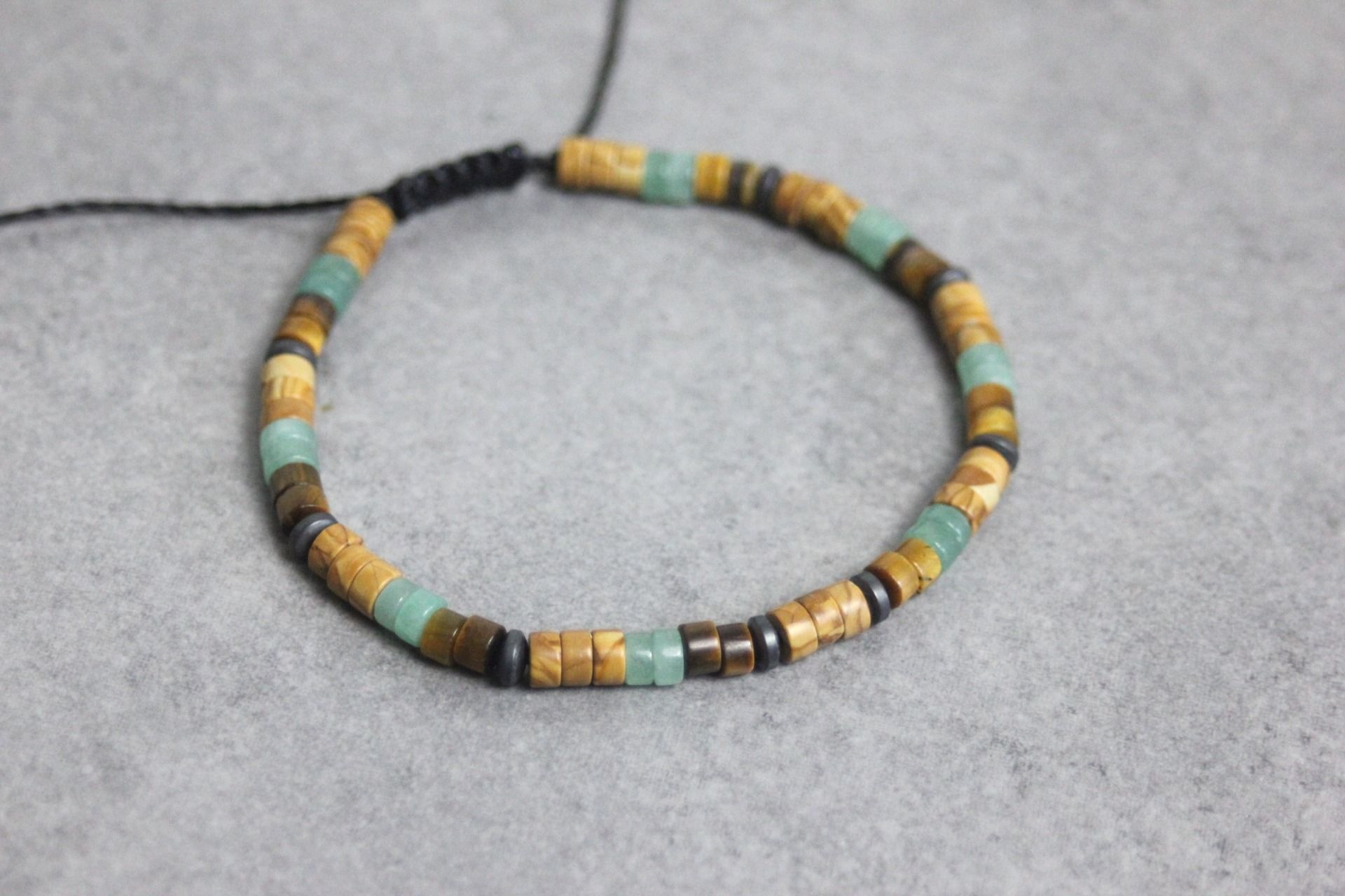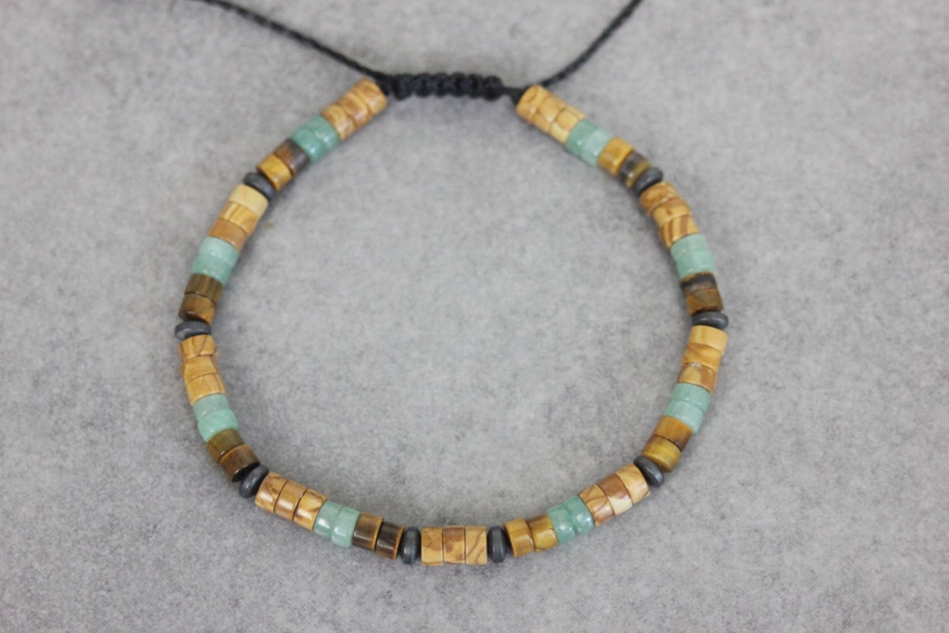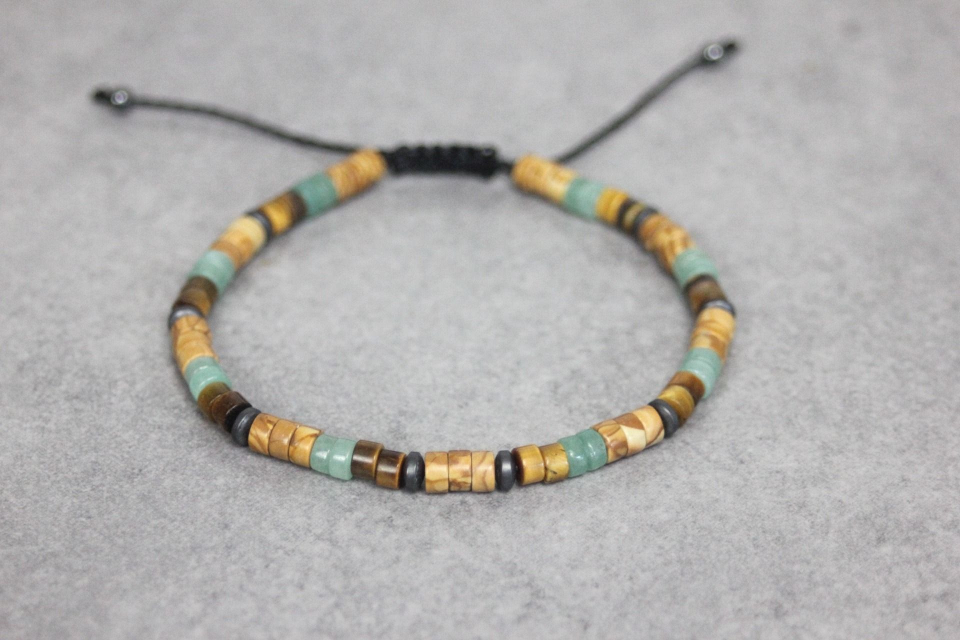 Bracelet homme perles heishi en wood stone, jade verte, œil de tigre et hématite mat Ø4mm - bracelet pierres naturelles - bracelet pierres gemmes - Bracelet surfeur