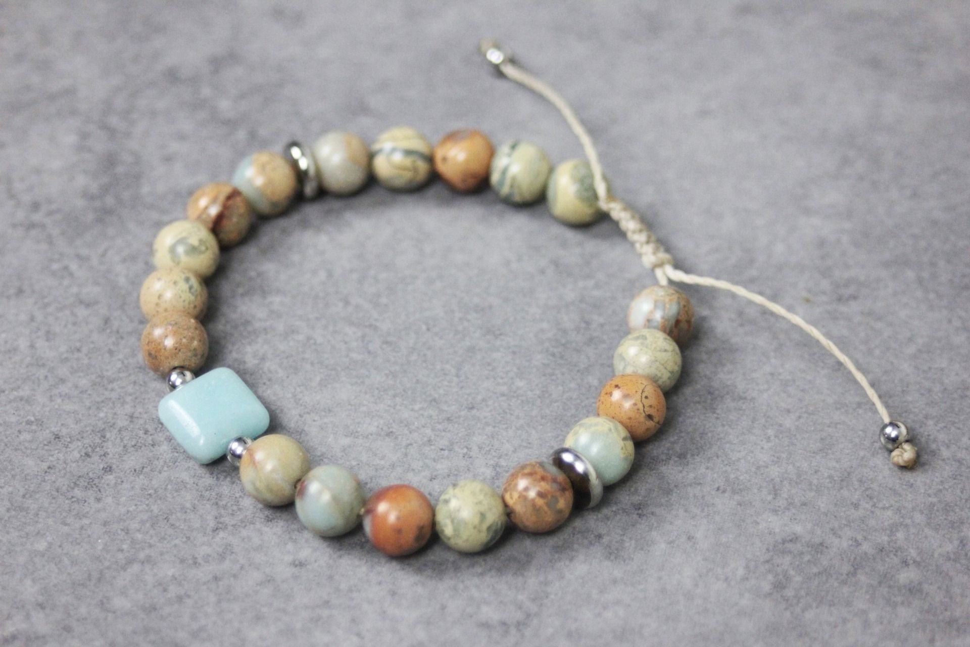 Bracelet en pierres naturelles semi-précieuses et acier inoxydable. Matériaux utilisés : perles jaspe impériale peau de serpent, amazonite et perles en acier inoxydable. Fermoir coulissant (convient à tous les poignets)