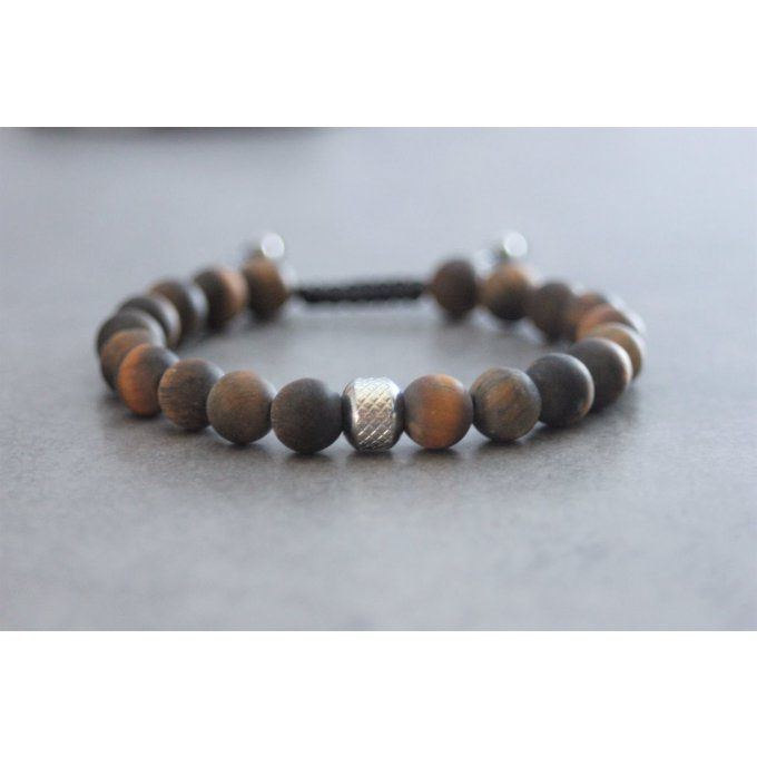 Bracelet en pierres naturelles semi-précieuses et acier inoxydable. Matériaux utilisés : perles œil de tigre mat et perles en acier inoxydable. Fermoir coulissant (convient à tous les poignets)