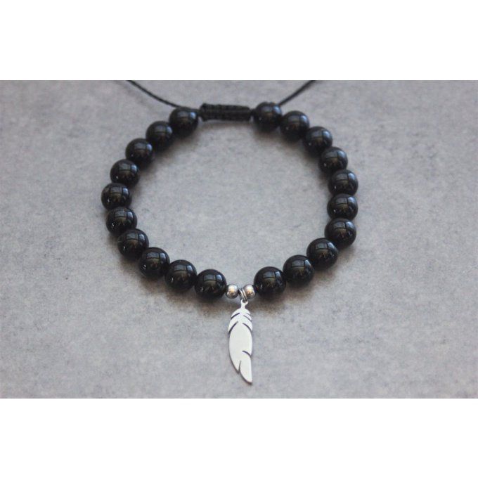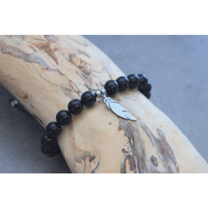 Bracelet perles onyx et plume acier inoxydable