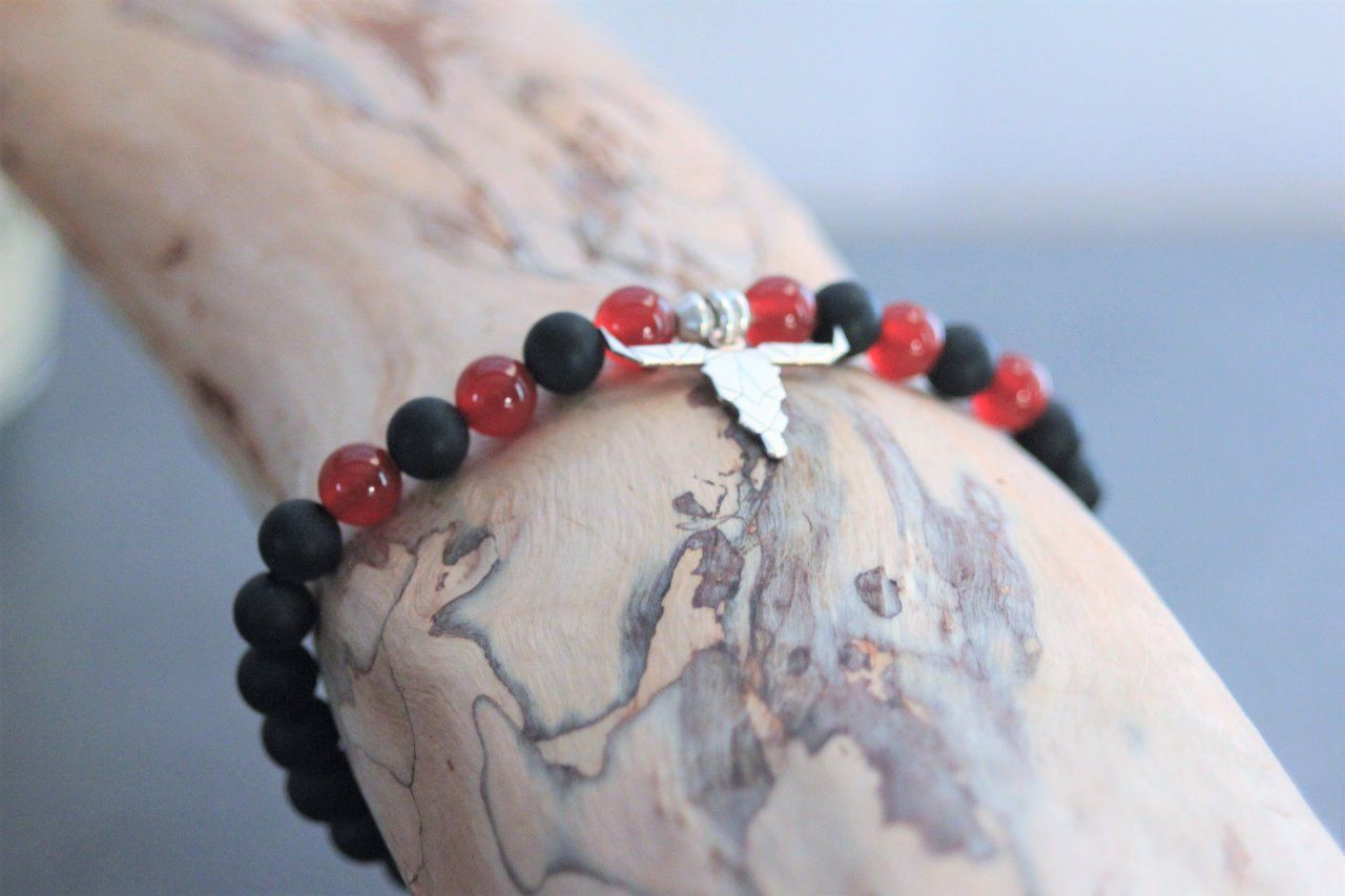 Bracelet en pierres naturelles semi-précieuses et argent massif 925. Matériaux utilisés : perles onyx mat, perles agate rouge et perles argent massif 925. Fermoir coulissant (convient à tous les poignets)